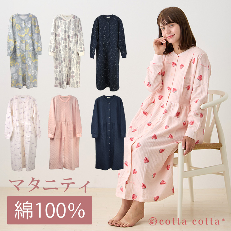 パジャマ マタニティ ワンピース 大きいサイズ ネグリジェ レディース 綿100% キルトニット 長袖 前開き 冬 冬用 秋冬 cottacotta ニットキルト ルームウェア