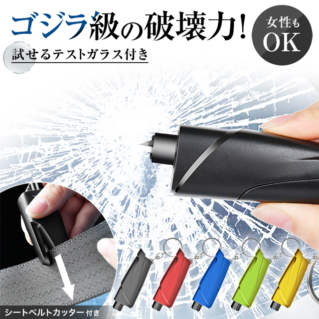 ・ガラスの簡単粉砕・シートベルトカッター付き・コンパクト・高耐久・簡単操作・テスト用ガラス付き