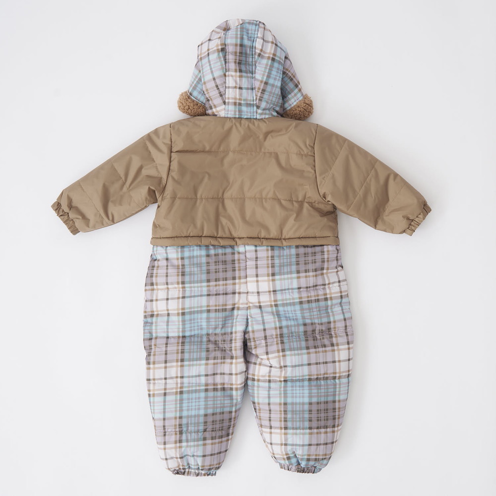 ●冬遊びに最適な中綿入りのジャンプスーツは膝下までのファスナー付きで着脱しやすい設計。袖部分の裏地は出し入れがスムーズなポリエステル素材、袖以外は肌触りの良いフリース素材で暖かい仕様になっています。フード内側ボア使い。●耐水圧2000mm