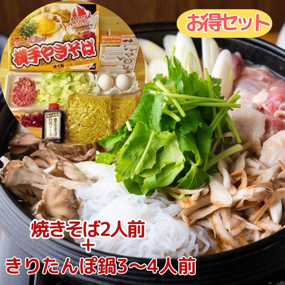 【お得セット】きりたんぽ鍋セット(3〜4人前)+横手焼きそば2人前 秋田名物 グルメ あきたこまち740のきりたんぽ、比内地鶏、三関せり、特性スープ付き 全部秋田県の具材フルセット 旨みたっぷりの老舗食い道楽の味をご家庭でまで 冷蔵【お歳暮ギフト】【お中元ギフト】【沖縄・離島は発送不可】名称 きりたんぽ鍋セット(3〜4人前)<原材料>自家製比内地鶏スープ(醤油、比内地鶏トリガラ、みりん、うまみ調味料)あきたこまち、比内地鶏、湯沢市三関産セリ、秋田県産ネギ秋田県産舞茸、ごぼうささがき、横手の糸こんにゃく横手の油揚げ、秋田県産なめこ<内容量>老舗食い道楽の自家製比内地鶏スープ 1000ccきりたんぽ 5本比内地鶏 150g湯沢市三関産セリ 1束秋田県産ネギ 1本秋田県産舞茸 100gごぼうささがき 100g横手の糸こんにゃく 1袋横手の油揚げ 2枚秋田県産なめこ 100g◆名称 やきそば 冷蔵 (横手やきそば)<原材料名>麺:小麦粉、食塩、かんすい、着色料(ビタミンB2)ソース:糖類(ぶどう糖果糖液糖、砂糖)、醸造酢、野菜、果実(トマト、リンゴ、にんじん、たまねぎ)、食塩、和風ダシ(かつお、コンブ)、調味料(アミノ酸等)鳥油:とり皮、ねぎ、しょうが、ニンニク福神漬:大根、キュウリ、なす、しその葉、ごま〔食塩、醤油、糖類(果糖ぶどう糖、液糖、砂糖)、アミノ酸液〕 酸味料、調味料(アミノ酸)、甘味料(サッカリンNa、カンゾウ)、保存料(ソルビン酸K)、着色料(赤102、黄4、黄5、赤106)(原材料の一部に小麦、大豆を含む)<内容量>麺180g×2食入、ソース180cc×1本、鳥油5cc×1本、福神漬10g×1袋、ひき肉60g(1人前30g)、キャベツ60g(1人前30g)、玉ねぎ10g、卵2個<賞味期限>きりたんぽ鍋、横手やきそば共に発送日から5日間賞味期限にかかわらずお早めにお召し上がりください。<保存方法>要冷蔵(10℃以下で保存してください)※開封後は賞味期限にかかわらずお 早めにお召し上がりください。◆【熨斗対応商品】 のし対応・のし記名可 ◆ご希望のお客様は 備考欄:「ご購入後のカート内備考欄(名入れ箇所)」 へとご希望の熨斗を入力してください。◆お届け時間のご指定について午前中のお届け時間指定の場合、出荷が1日早くなります。お時間の指定がある場合は、なるべく午後のご指定にてお願い致します。◆ご注文の集中時について(お中元、お歳暮、年末年始など)・発送までに通常よりもお時間をいただく場合がございます。・ご希望のお届け日時指定をお受けできない場合ございます。・販売を一時休止させていただく場合などございます。恐れ入りますが予めご了承くださいませ。【沖縄・離島は発送不可】※生産元より直送のため、明細書はございません。