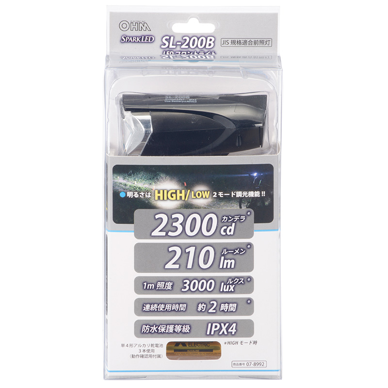 【 特 長 】● 明るさはHIGH/LOW 2モード調光機能つき● 光度2300カンデラ● 光束210ルーメン● 1m照度3000ルクス● 連続使用時間 約2時間● 防水保護等級 IPX4(防まつ形)● 下方照射重視の多面体反射鏡により、広範囲かつ下方の路面を明るく照らします。正面から見てもまぶしくありません● 電池交換の時期が分かる「電池残量インジケーター」つき。電池の容量が少なくなると赤く点灯します● ホルダーは25〜32mmのパイプに取り付けられます● 簡単脱着しやすいホルダーを採用