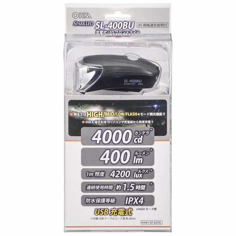 オーム電機 充電式LEDフロントライト SPARKLED SL-400BU-K【品番:07-6376】