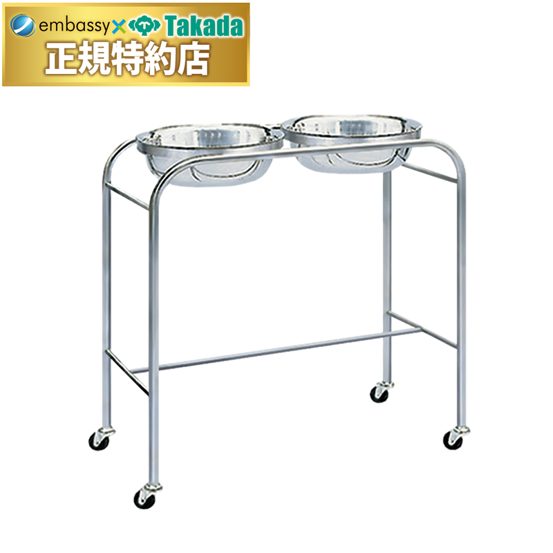 医療用として衛生的に使用できる錆びにくいステンレス製消毒手洗台。直径5cmの単輪キャスター付き。脱着が容易で衛生的な深鉢2個付き。
