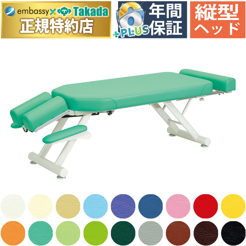 うつ伏せでの施術に最適な緊張を緩和する専用手置き台付き施術台。縦型調節式ヘッド。ガスシリンダー式角度調節機能付き。15〜−40°。患者様の身長に応じて30cmの伸縮が可能なフットレスト機能付き。※ロールペーパー取付金具標準装備。(ロールペーパー1本付属) ※ヘッドの幅は微調節できます。