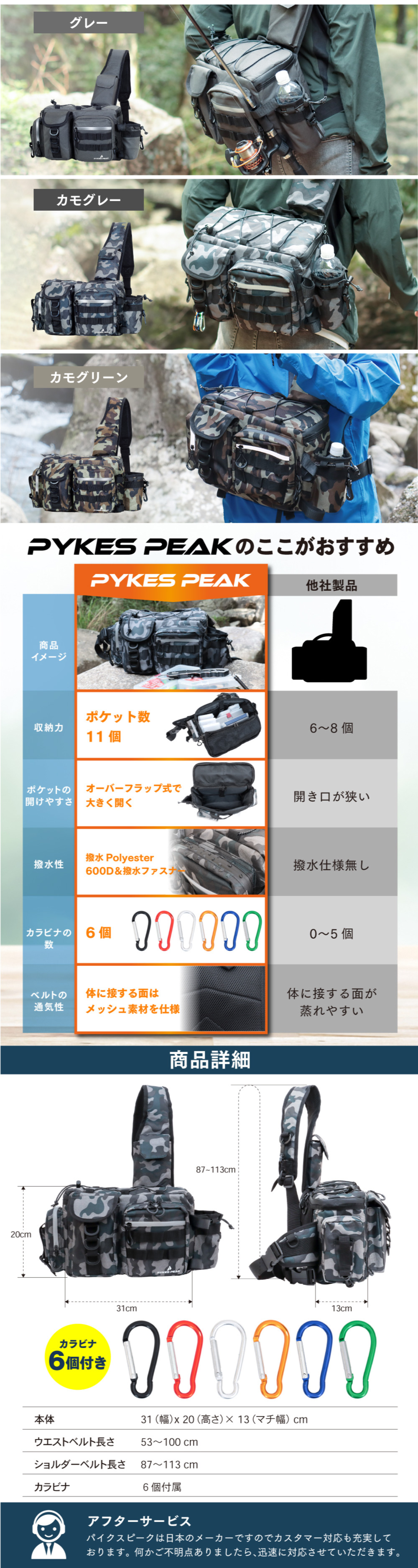 フィッシングバッグ タックル ショルダー ウエスト ランガン 防水 大容量 カラビナ6個 Lサイズ 釣り用のバッグ 肩 釣り用ショルダーバッグ Lサイズ コンパクト 撥水 PYKESPEAK