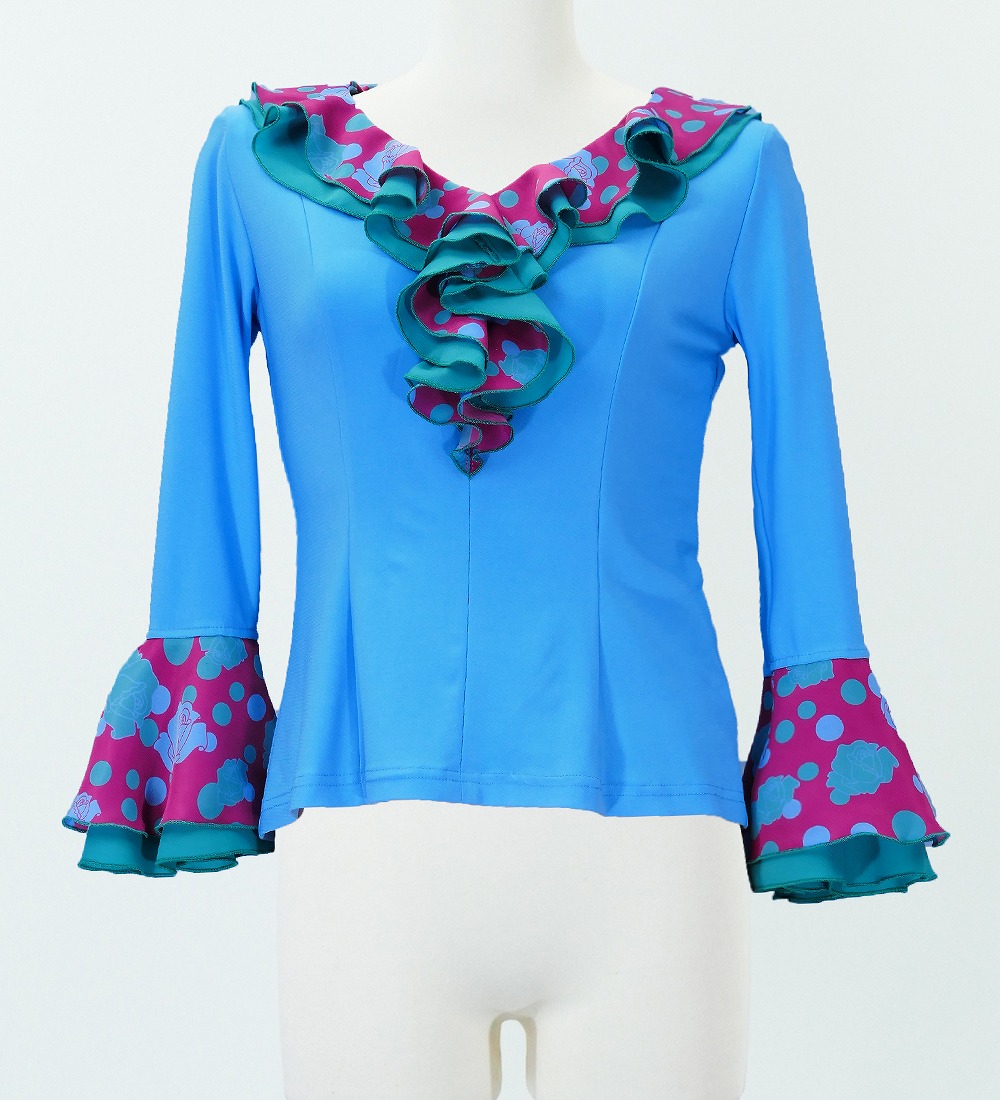 フラメンコ ローズ&水玉 フリル ブラウス ライトブルー×パープル フリーサイズ 2349lbpf