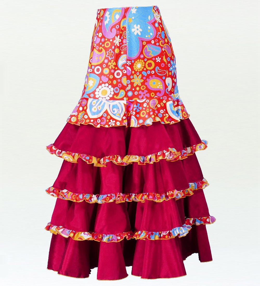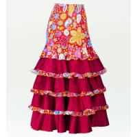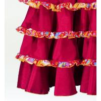 emikaオリジナルのプリントベルベット生地とつやのあるシャンタン生地を使用したゴージャスな5段フリルファルダ。