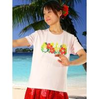 ハイビスカスとモンステラ・プルメリアをフロントにプリント。すっきり見えてパウスカートにも合わせやすいのが特徴です。