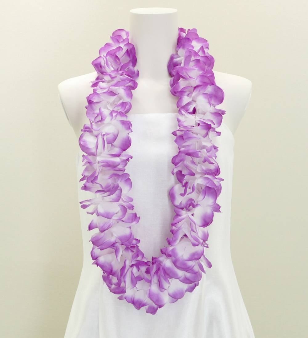 柔らかめの花びらのみを使用したレイはムームーやパウスカート等どんなフラダンス衣装ともコーディネートでき簡易のホイケ等にも使用出来ます。