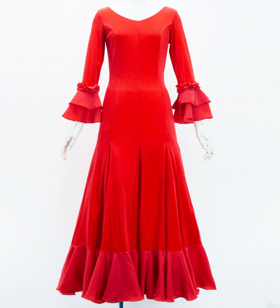 フラメンコ ベルベット フリル ワンピース ダークレッド S-Lサイズ FD-2