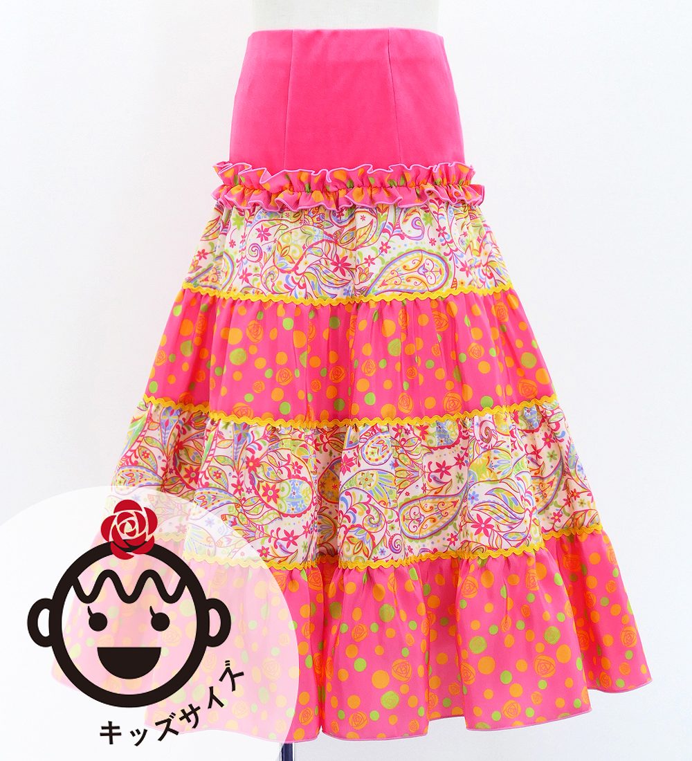 キッズ フラメンコ ティアードスカート ペイズリー×水玉 ピンク×イエロー 120・140サイズ FSp-16