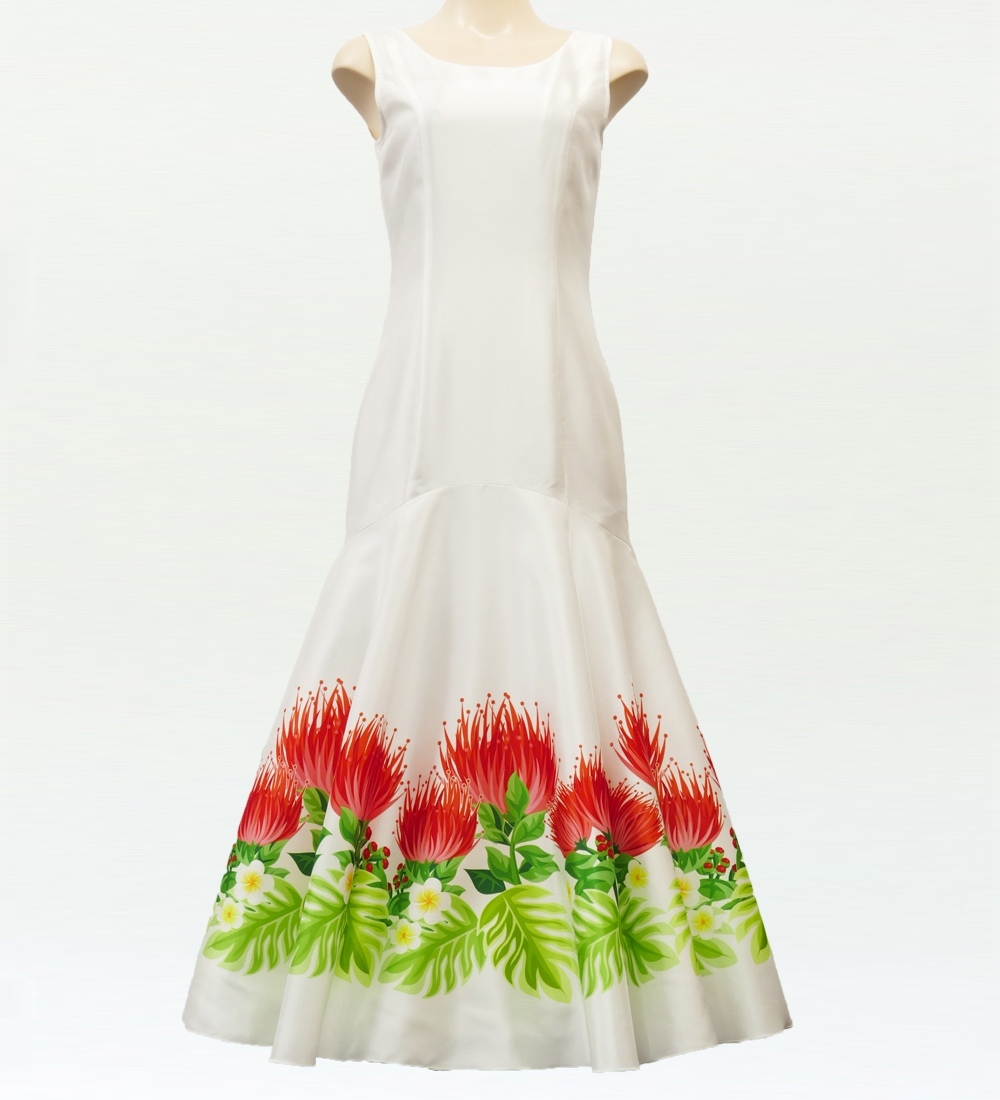 すっきりとした首元とボリュームのある裾のシルエット、豪華なレフアの模様が特徴です。