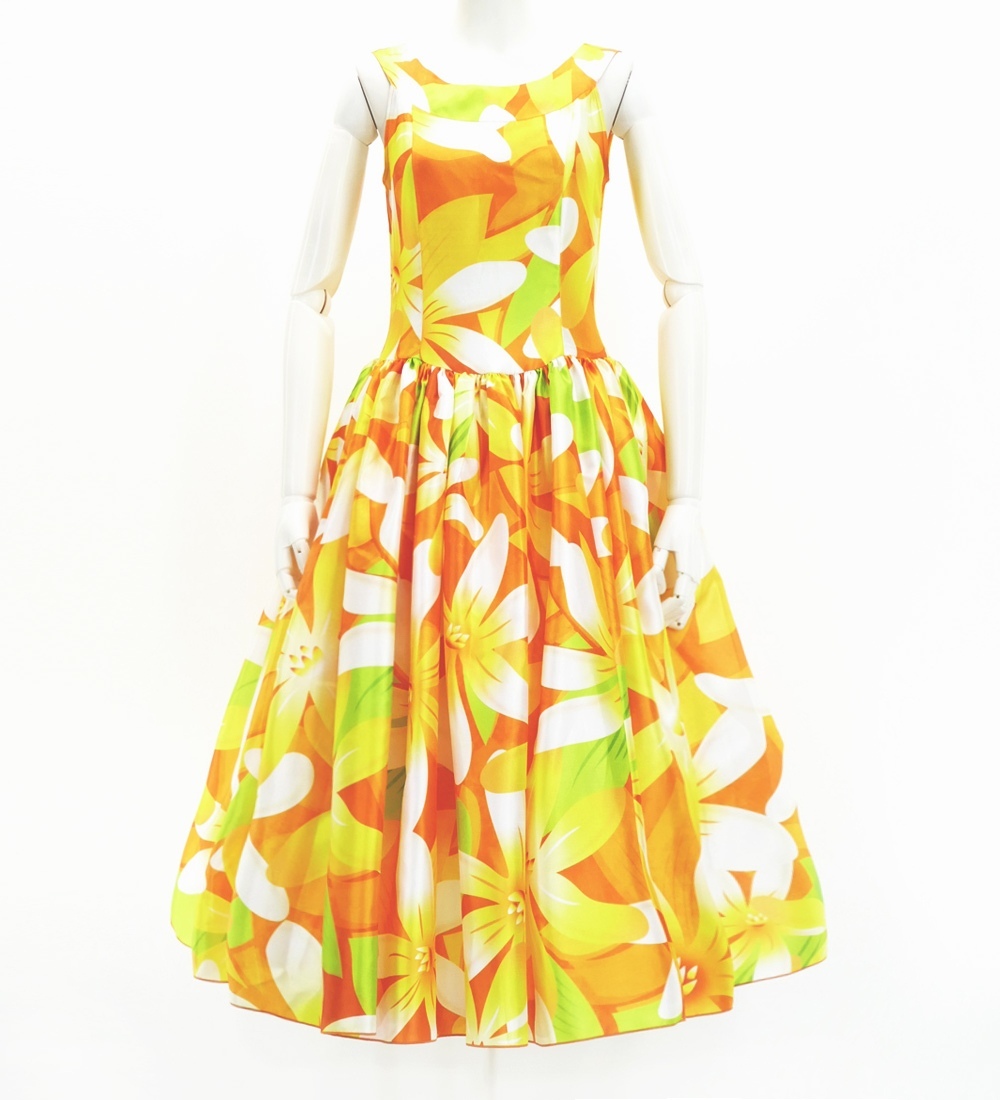 ハワイアンプリント シャンタン生地の日本製フラドレス J2688or