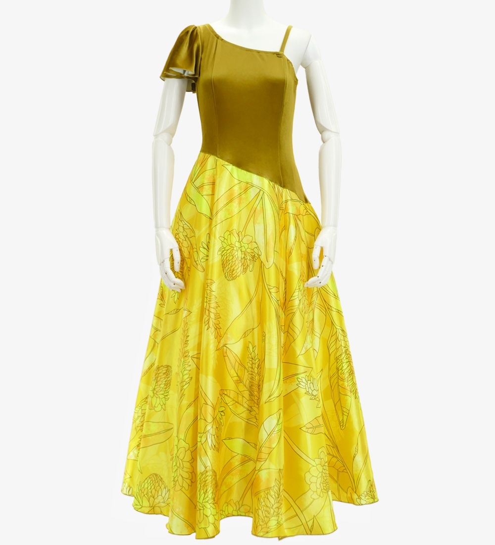 高級ベルベット生地とシャンタン生地の切り替えロング丈ドレス ハワイアンプリント フラドレス日本製 J2690ye