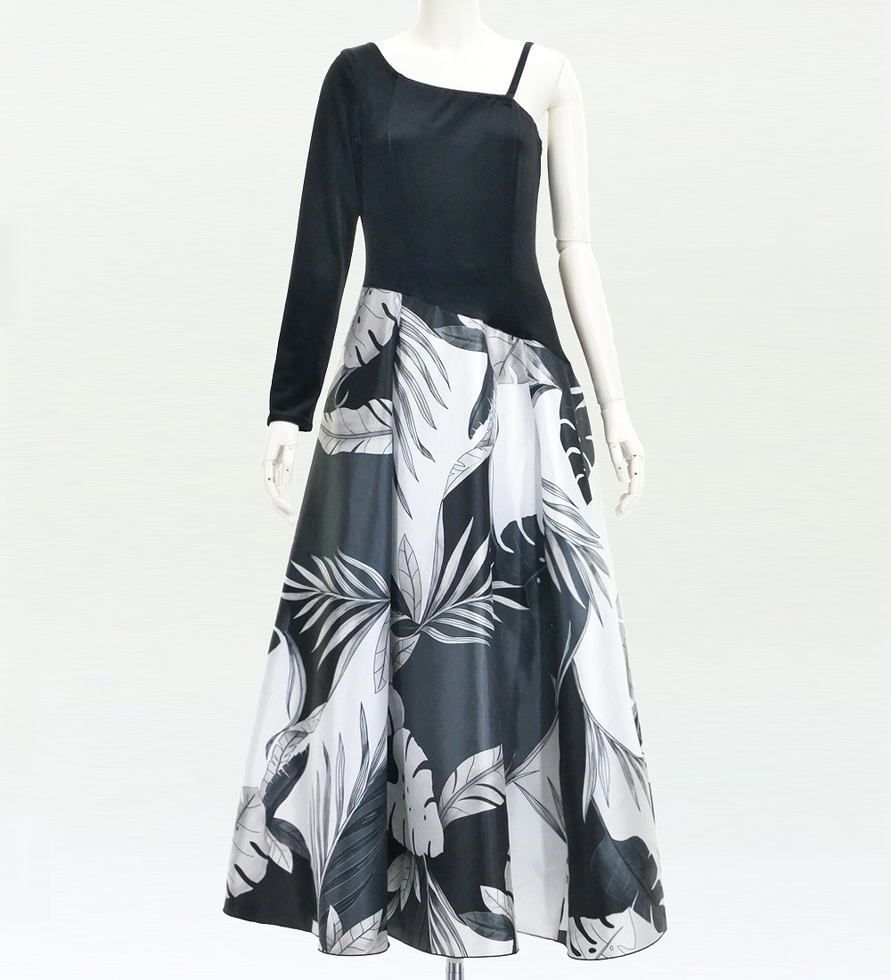 高級ベルベット生地とシャンタン生地 ロング丈ドレス ハワイアンプリント フラドレス日本製 J2754gy