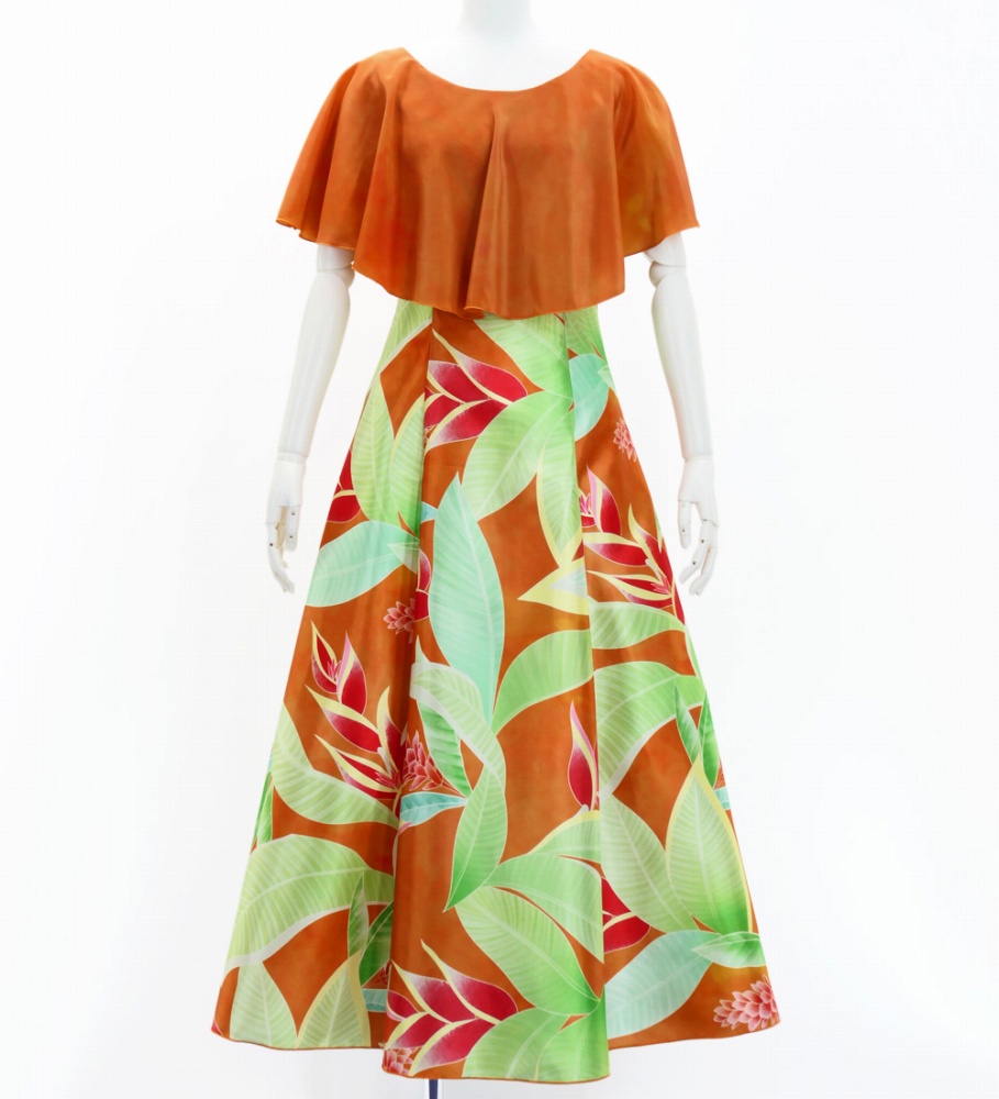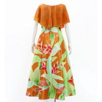 シャンタン生地のロング丈ケープドレス ハワイアンプリント フラドレス日本製 J2873or