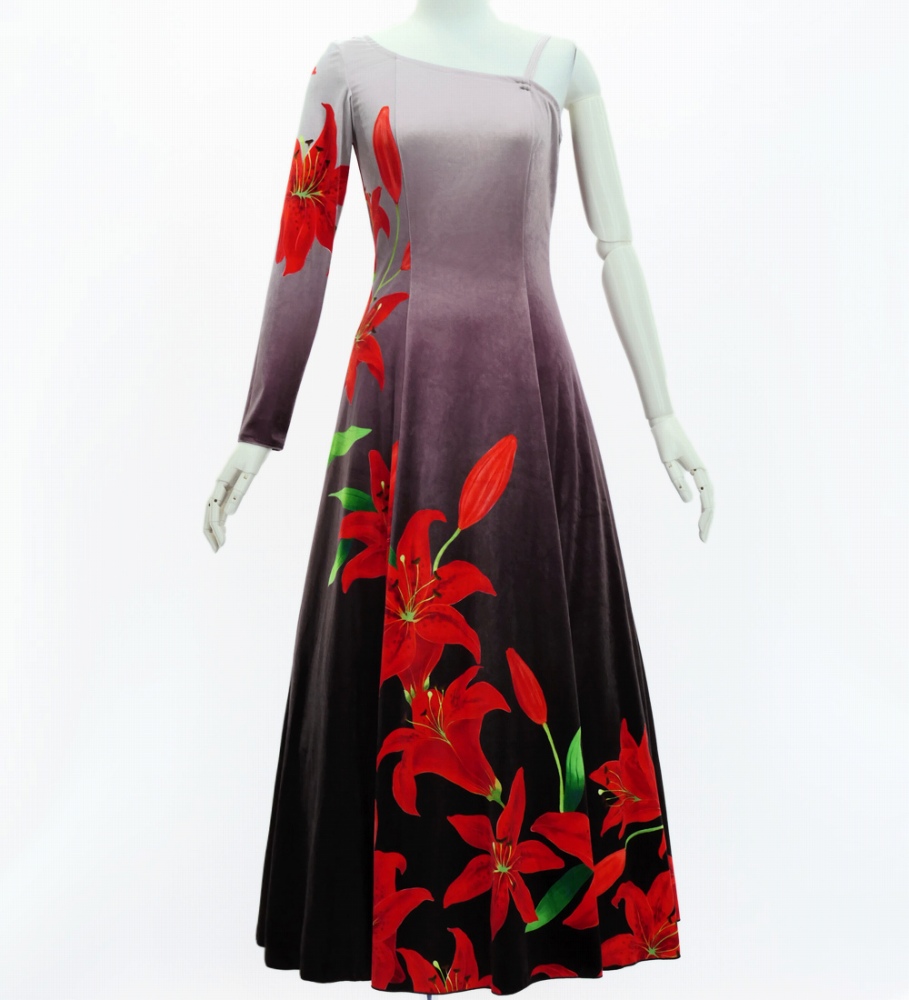 emikaオリジナルのストレッチベロア生地を使用した、 グラデーションに斜めに入るリリー柄が美しいワンショルダードレスです。