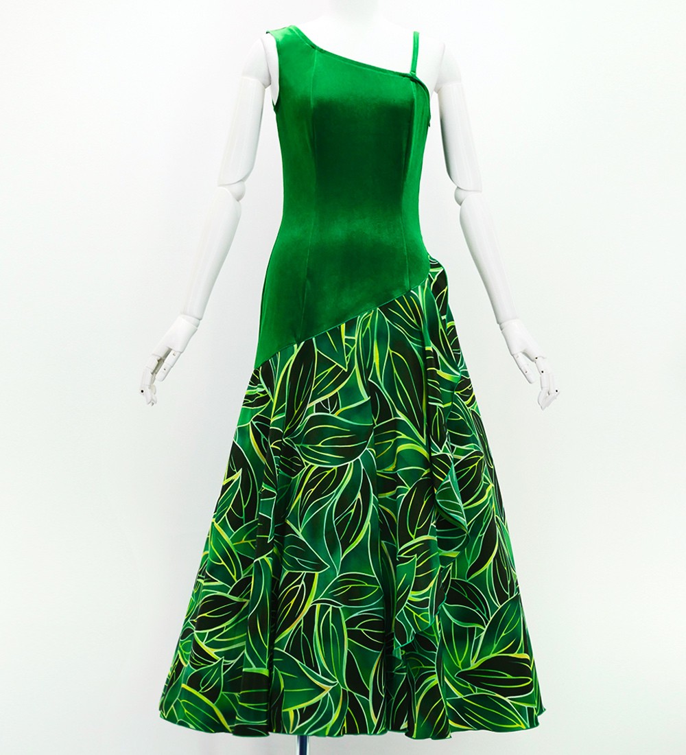 ベロア×コシボ生地のロング丈ワンショルダー ノースリーブ ハワイアンプリント フラドレス日本製 J3088dgr
