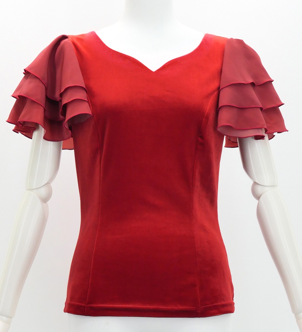 伸縮性・高級感のあるストレッチベロア生地、袖には軽やかなコシボ生地を使用した3段フリルスリーブブラウス。