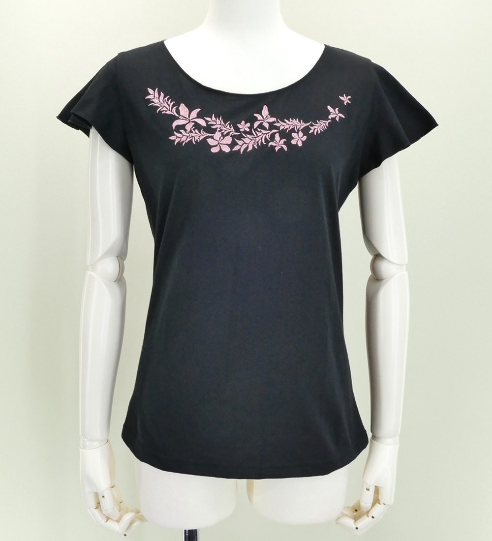 フレンチフリル Tシャツ F 刺繍ピンク ハイビスカス ブラック KD3pibF