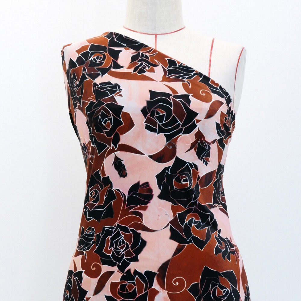 フラメンコ生地 ローズ柄 コシボ・シャンタン・ストレッチベロア選べる生地 ブラウン KF-065-BR 3-5営業日後発送