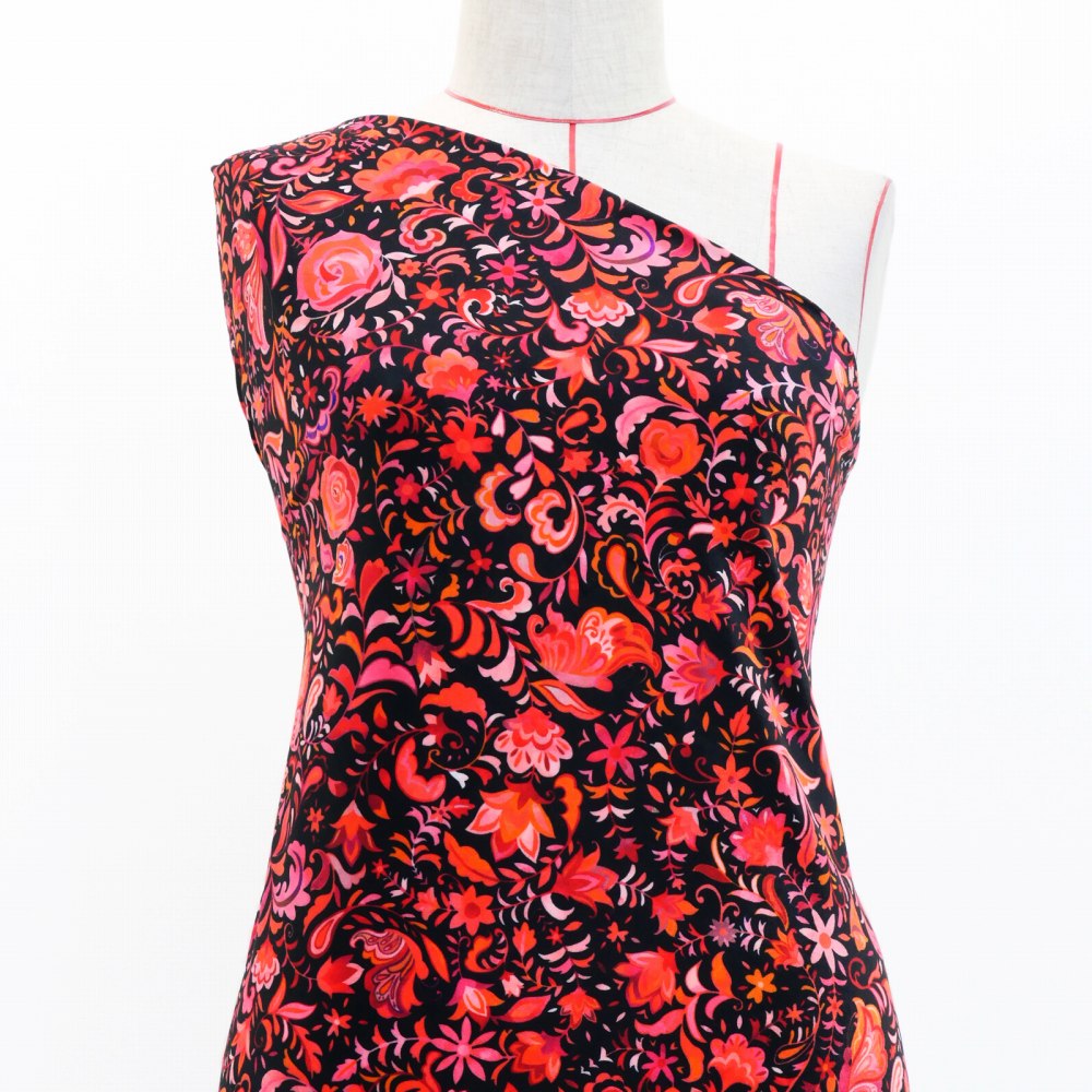 フラメンコ生地 バタフライペイズリー柄 コシボ・シャンタン・ストレッチベロア選べる生地 ブラック×レッド KF-085-BKRD 3-5営業日後発送