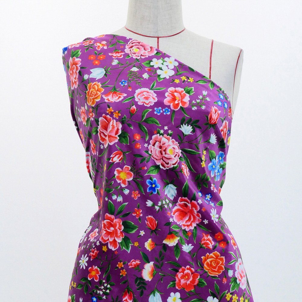 フラメンコ生地 花柄 コシボ・シャンタン・ストレッチベロア選べる生地 パープル KF-089-PU 3-5営業日後発送