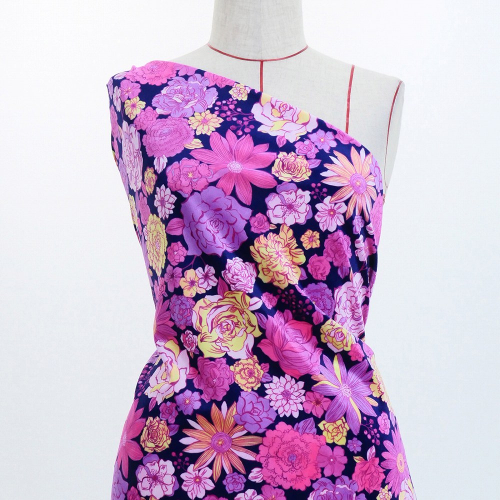 フラメンコ生地 モダンフラワー柄 コシボ・シャンタン・ストレッチベロア選べる生地 ネイビー×ピンク KF-091-NVPI 3-5営業日後発送