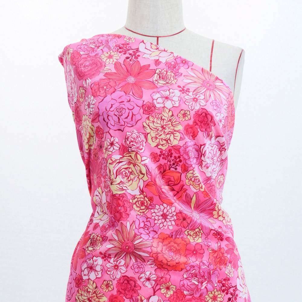 フラメンコ生地 モダンフラワー柄 コシボ・シャンタン・ストレッチベロア選べる生地 ピンク KF-091-PI 3-5営業日後発送