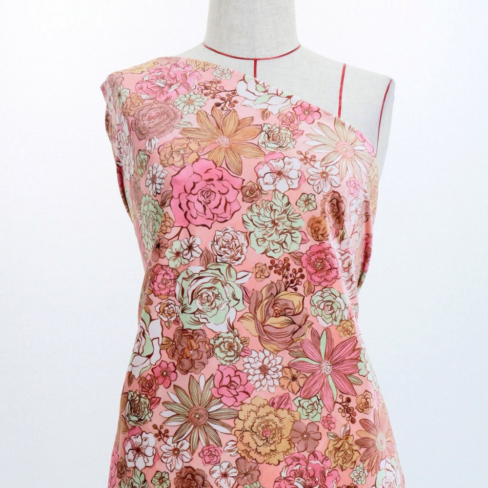 フラメンコ生地 モダンフラワー柄 コシボ・シャンタン・ストレッチベロア選べる生地 ピンクベージュ KF-091-PIBE 3-5営業日後発送