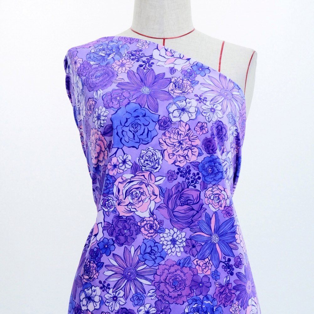 フラメンコ生地 モダンフラワー柄 コシボ・シャンタン・ストレッチベロア選べる生地 パープル KF-091-PU 3-5営業日後発送