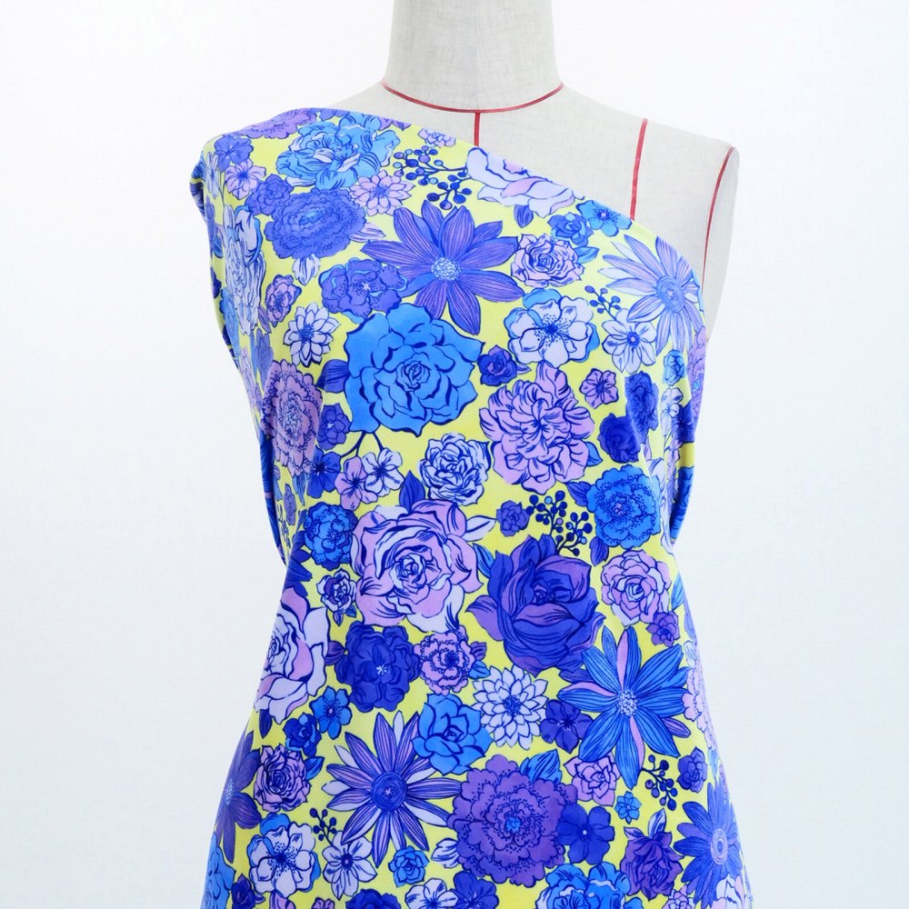 フラメンコ生地 モダンフラワー柄 コシボ・シャンタン・ストレッチベロア選べる生地 イエロー×パープル KF-091-YEPU 3-5営業日後発送