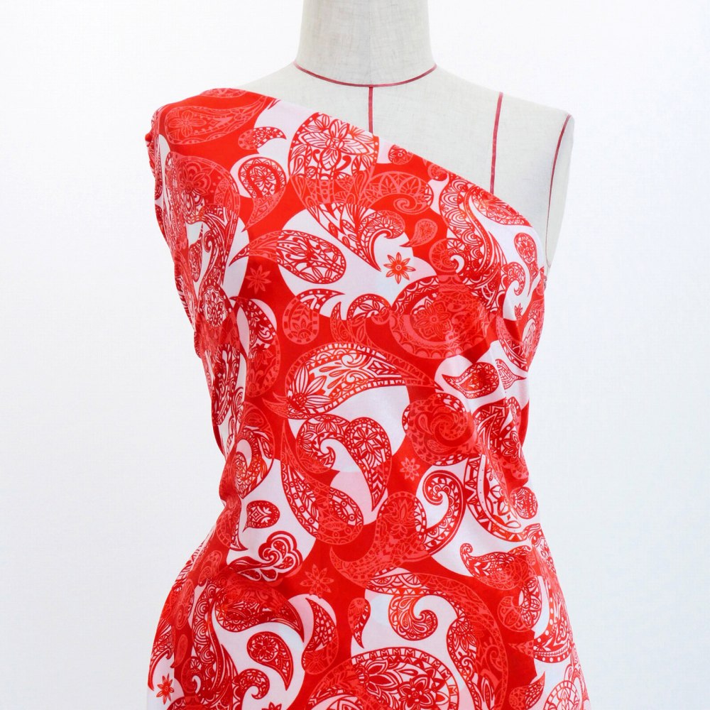 フラメンコ生地 ペイズリー×水玉柄 コシボ・シャンタン・ストレッチベロア選べる生地 レッド KF-093-RD 3-5営業日後発送