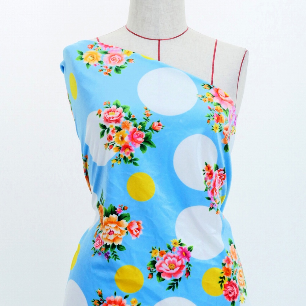 フラメンコ生地 ブーケ×水玉柄 コシボ・シャンタン・ストレッチベロア選べる生地 ライトブルー KF-095-LBL 3-5営業日後発送