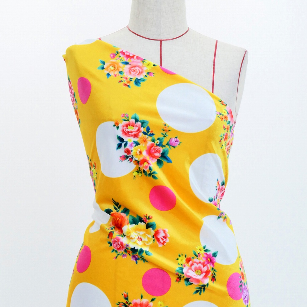 フラメンコ生地 ブーケ×水玉柄 コシボ・シャンタン・ストレッチベロア選べる生地 イエロー KF-095-YE 3-5営業日後発送