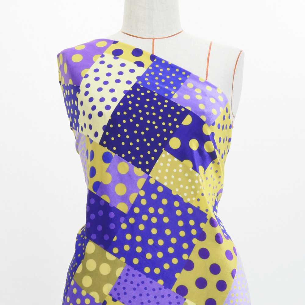 フラメンコ生地 水玉×パッチワーク柄 コシボ・シャンタン・ストレッチベロア選べる生地 イエロー×パープル KF-195-YEPU 3-5営業日後発送