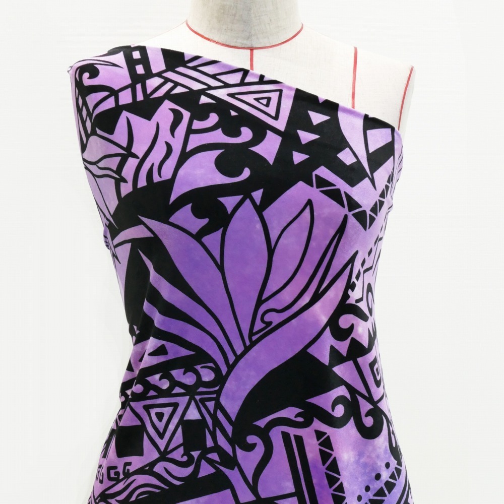 ハワイアン生地 ストレリチア×カヒコ柄 ストレッチベロア生地 パープル KH-552-PU-V 3-5営業日後発送
