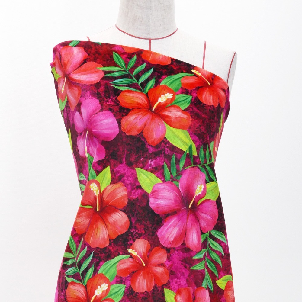 ハワイアン生地 ハイビスカス柄 ストレッチベロア生地 ピンク KH-554-PI-V 3-5営業日後発送