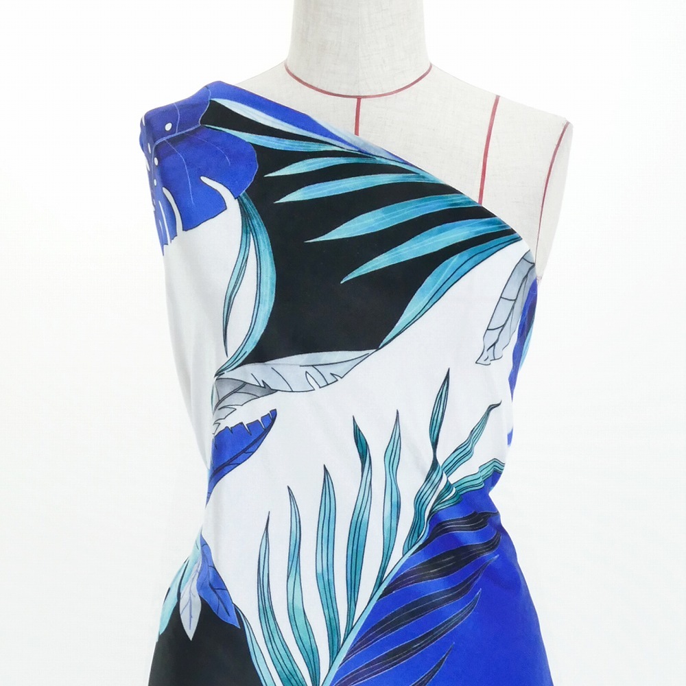 ハワイアン生地 モダンリーフ柄 ストレッチベロア生地 ブルー KH-572-BL-V 3-5営業日後発送