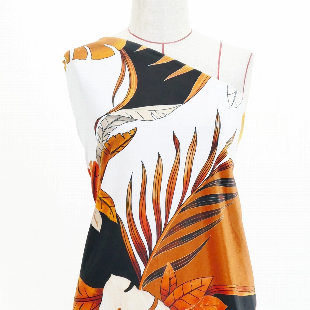 ハワイアン生地 モダンリーフ柄 ストレッチベロア生地 オレンジ KH-572-OR-V 3-5営業日後発送
