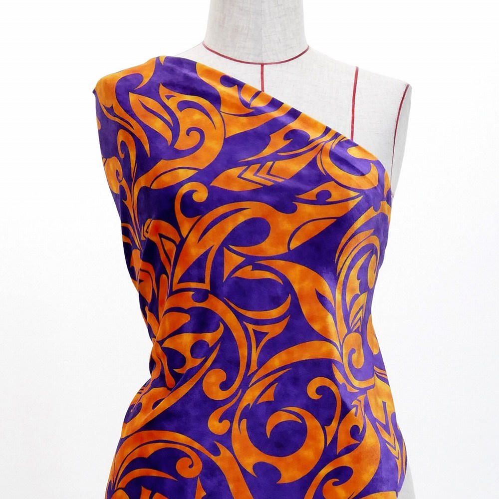 ハワイアン生地 カヒコ×ティアレ柄 コシボ・シャンタン・ストレッチベロア選べる生地 パープル×オレンジ KH-578-PUOR 3-5営業日後発送