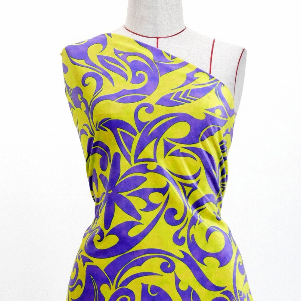 ハワイアン生地 カヒコ×ティアレ柄 コシボ・シャンタン・ストレッチベロア選べる生地 イエロー×パープル KH-578-YEPU 3-5営業日後発送