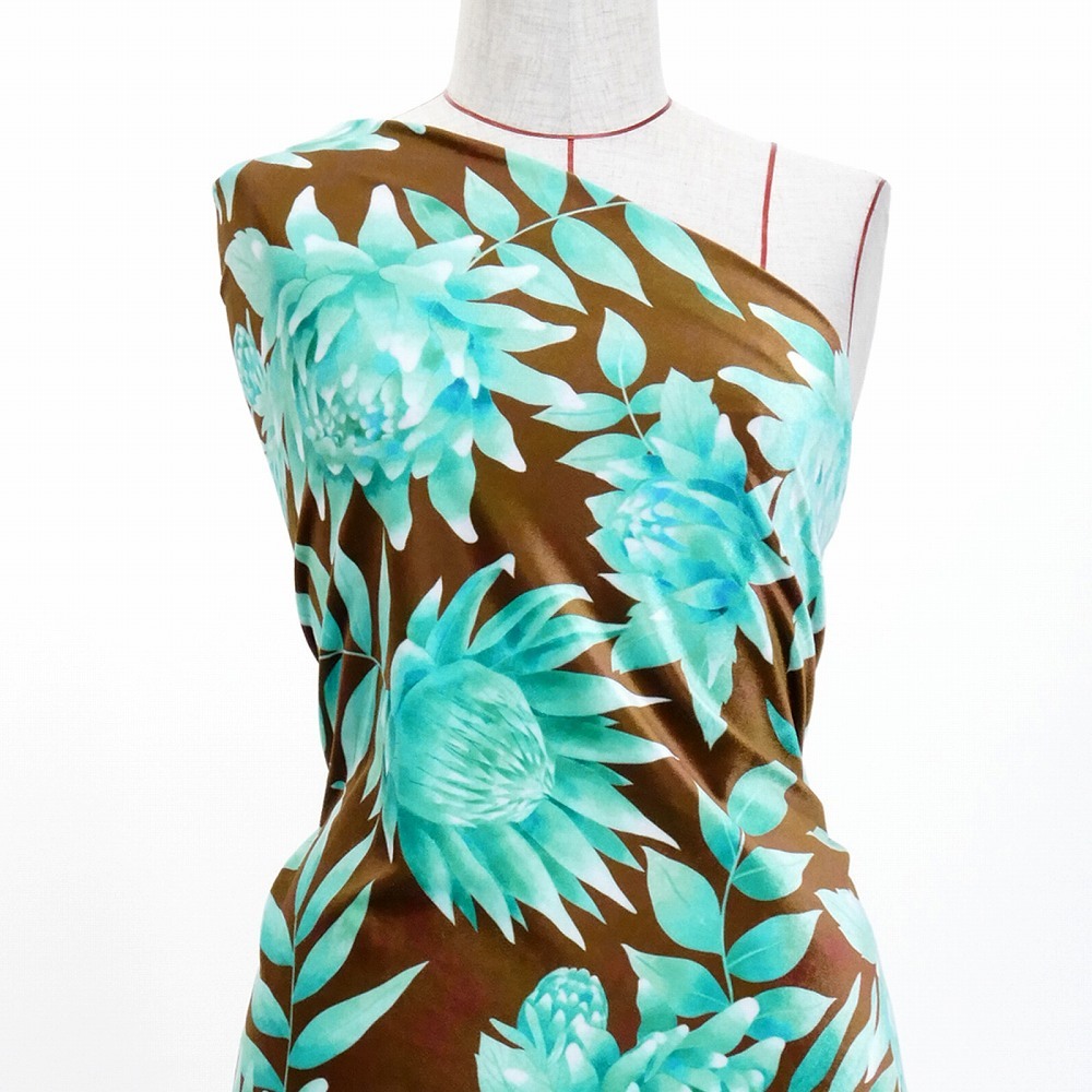 ハワイアン生地 プロテア柄 コシボ・シャンタン・ストレッチベロア選べる生地 ブラウン×ブルー KH-584-BRBL 3-5営業日後発送