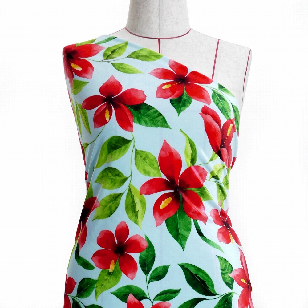 ハワイアン生地 ハイビスカス柄 コシボ・シャンタン・ストレッチベロア選べる生地 ライトブルー KH-586-LBL 3-5営業日後発送