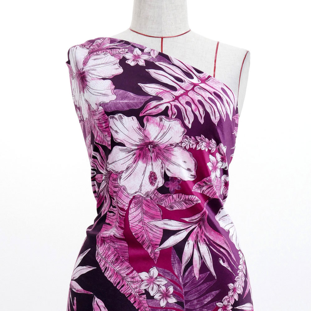 ハワイアン生地 ハワイアンフラワー柄 コシボ・シャンタン・ストレッチベロア選べる生地 レッドパープル KH-598-RDPU 3-5営業日後発送