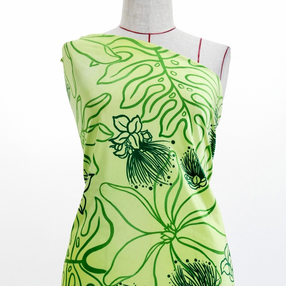 ハワイアン生地 レフア柄 コシボ・シャンタン・ストレッチベロア選べる生地 グリーン KH-602-GR 3-5営業日後発送