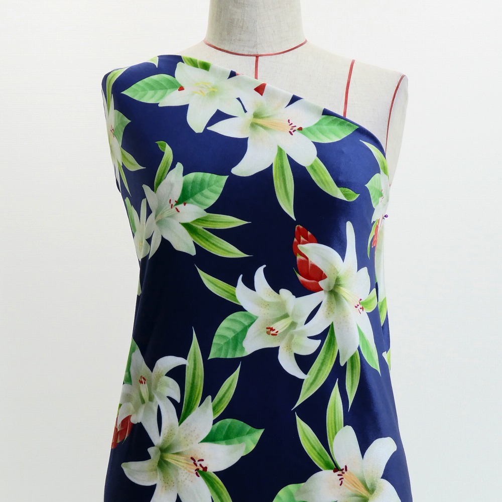 ハワイアン生地 リリー柄 コシボ・シャンタン・ストレッチベロア選べる生地 ネイビー KH-612-NV 3-5営業日後発送