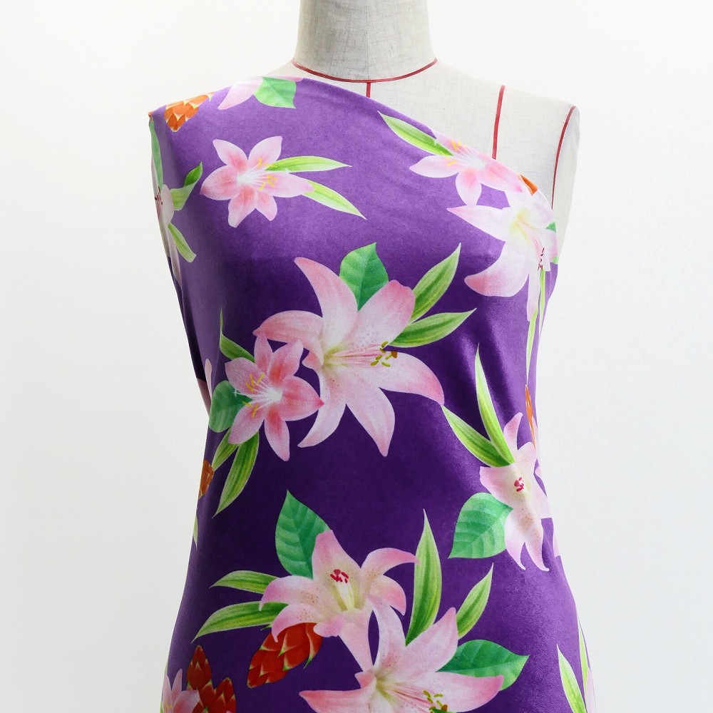 ハワイアン生地 リリー柄 コシボ・シャンタン・ストレッチベロア選べる生地 パープル KH-612-PU 3-5営業日後発送
