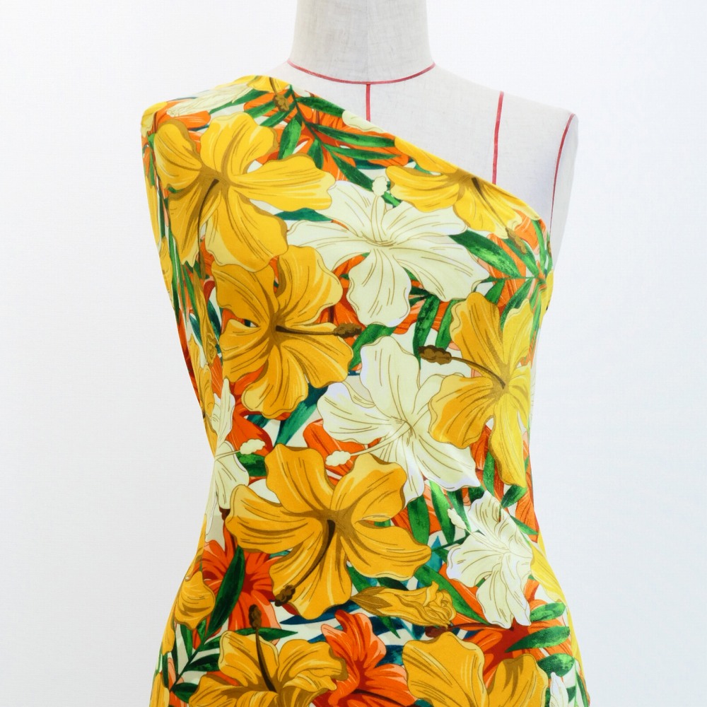 ハワイアン生地 ハイビスカス柄 コシボ・シャンタン・ストレッチベロア選べる生地 イエロー KH-616-YE 3-5営業日後発送