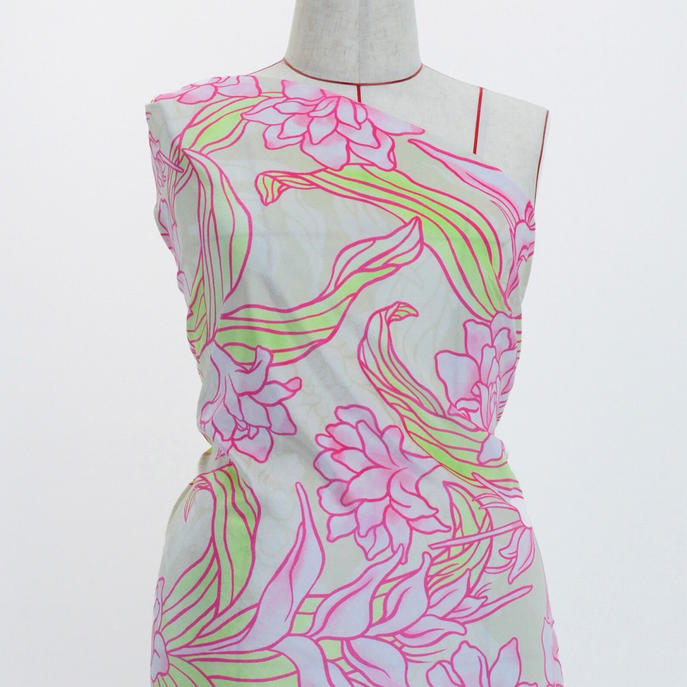 ハワイアン生地 チューブローズ柄 コシボ・シャンタン・ストレッチベロア選べる生地 ライトピンク KH-624-LPI 3-5営業日後発送